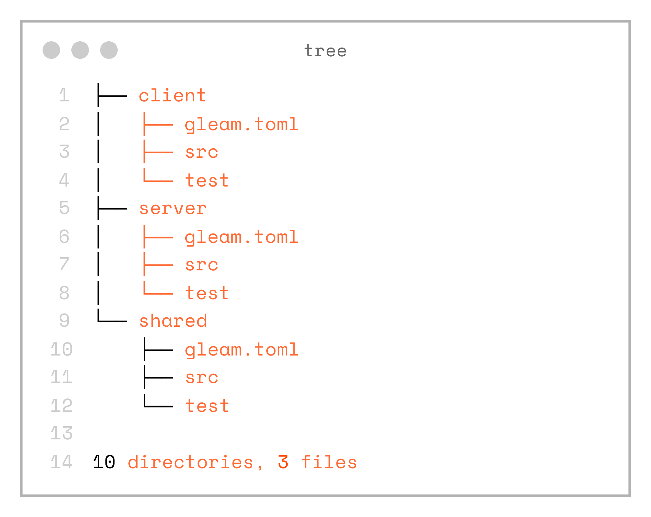 First, let’s setup the project structure. We will need 3 top level folders: server, client and shared. Each of them is a Gleam project: