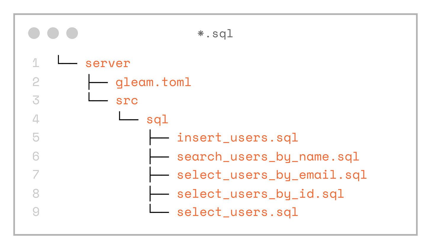 WHERE to_tsvector('simple', name) @@ plainto_tsquery('simple', $1);The SQL file names can be anything — it’s up to you to choose a convention. Keep in mind, however, that the generated code will use the file name both for the Gleam function name and for the generated record types.