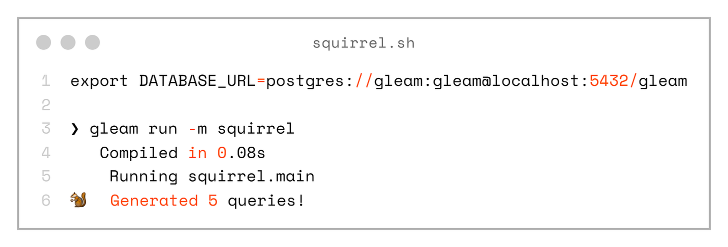 ❯ gleam run -m squirrel