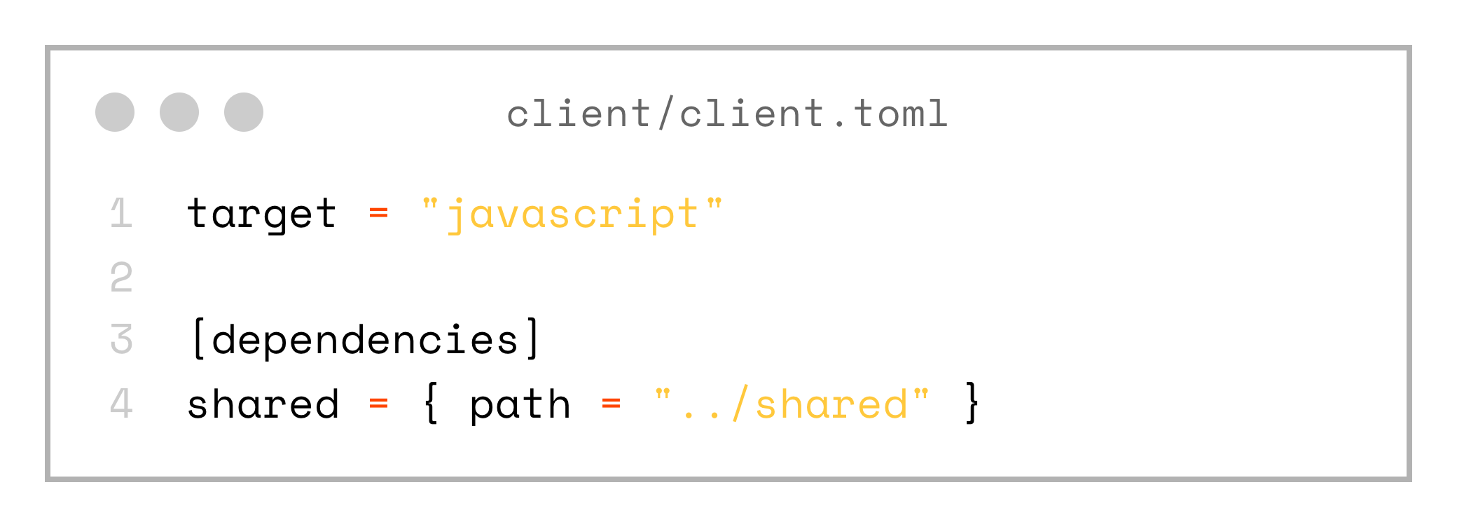 10 directories, 3 filesNote, that both client and server are using local dependency on the shared project. Aslo client is configured with javascript as the target.