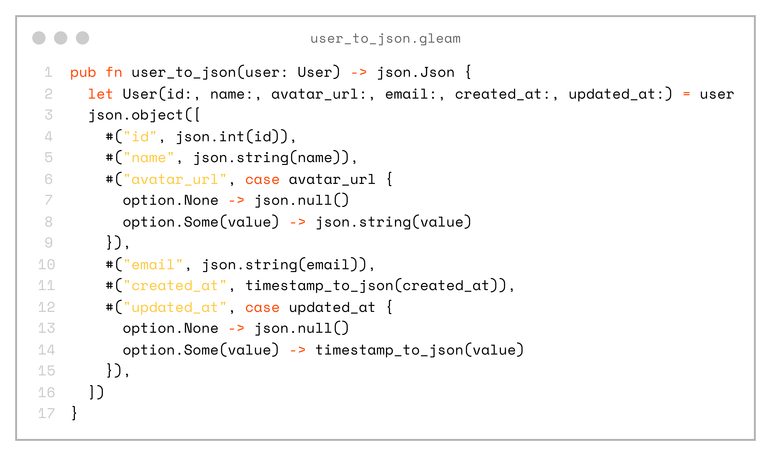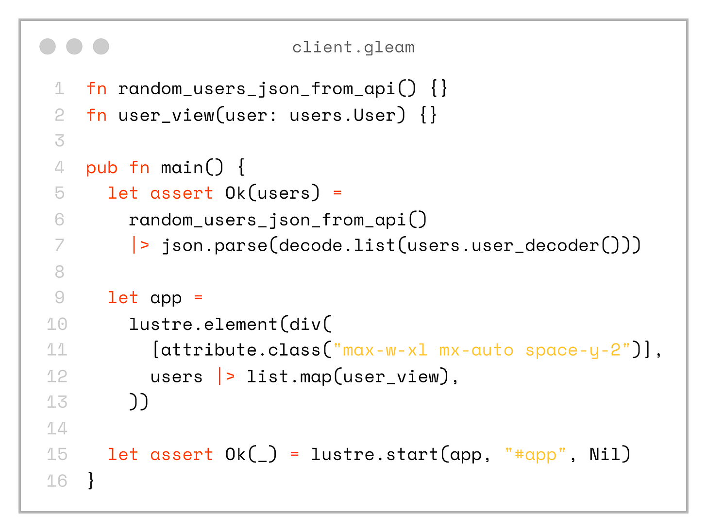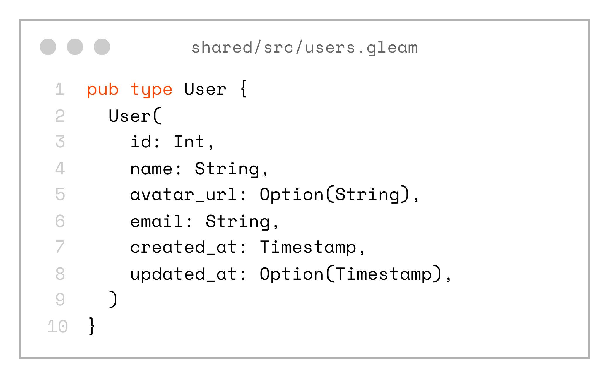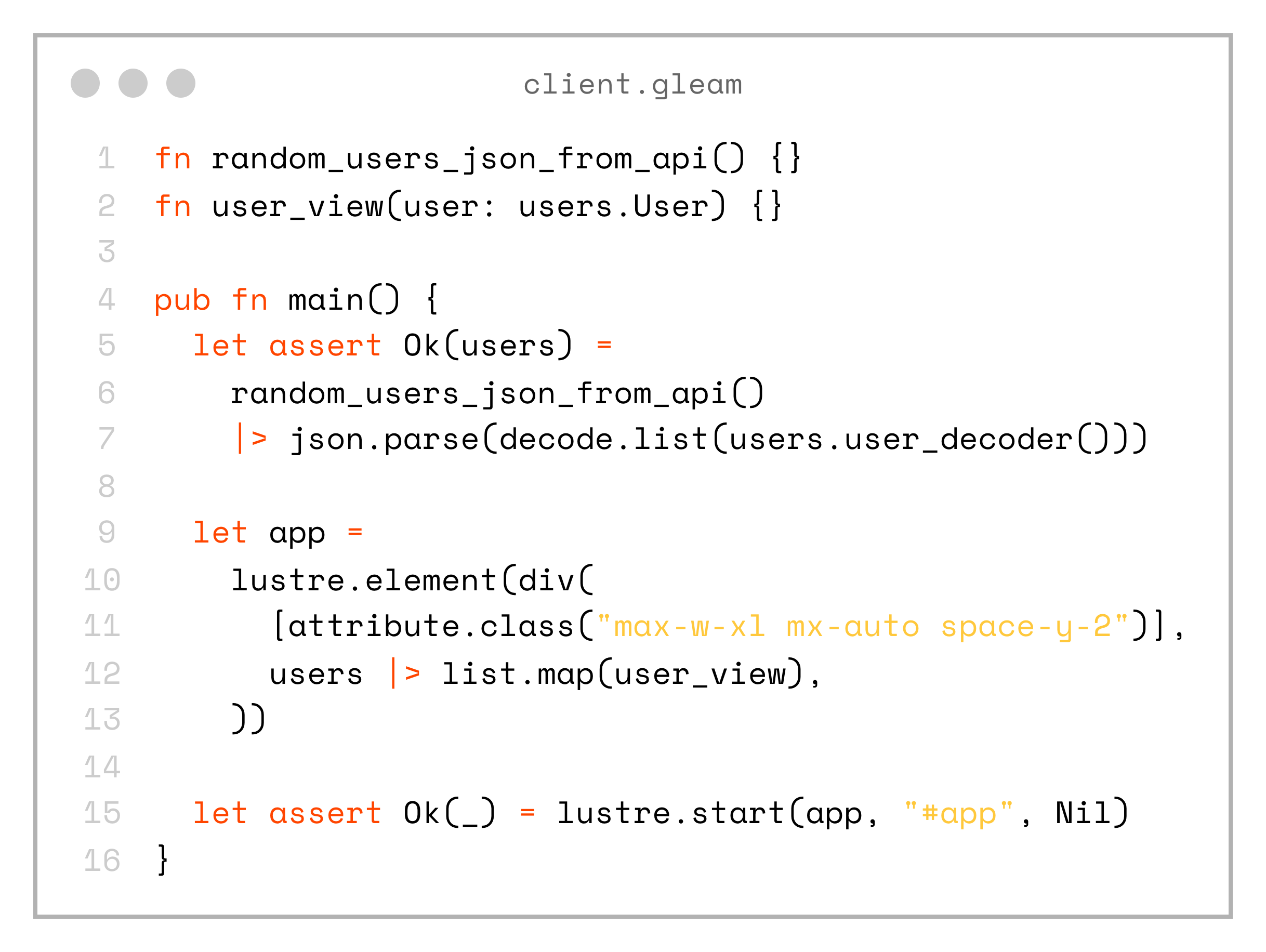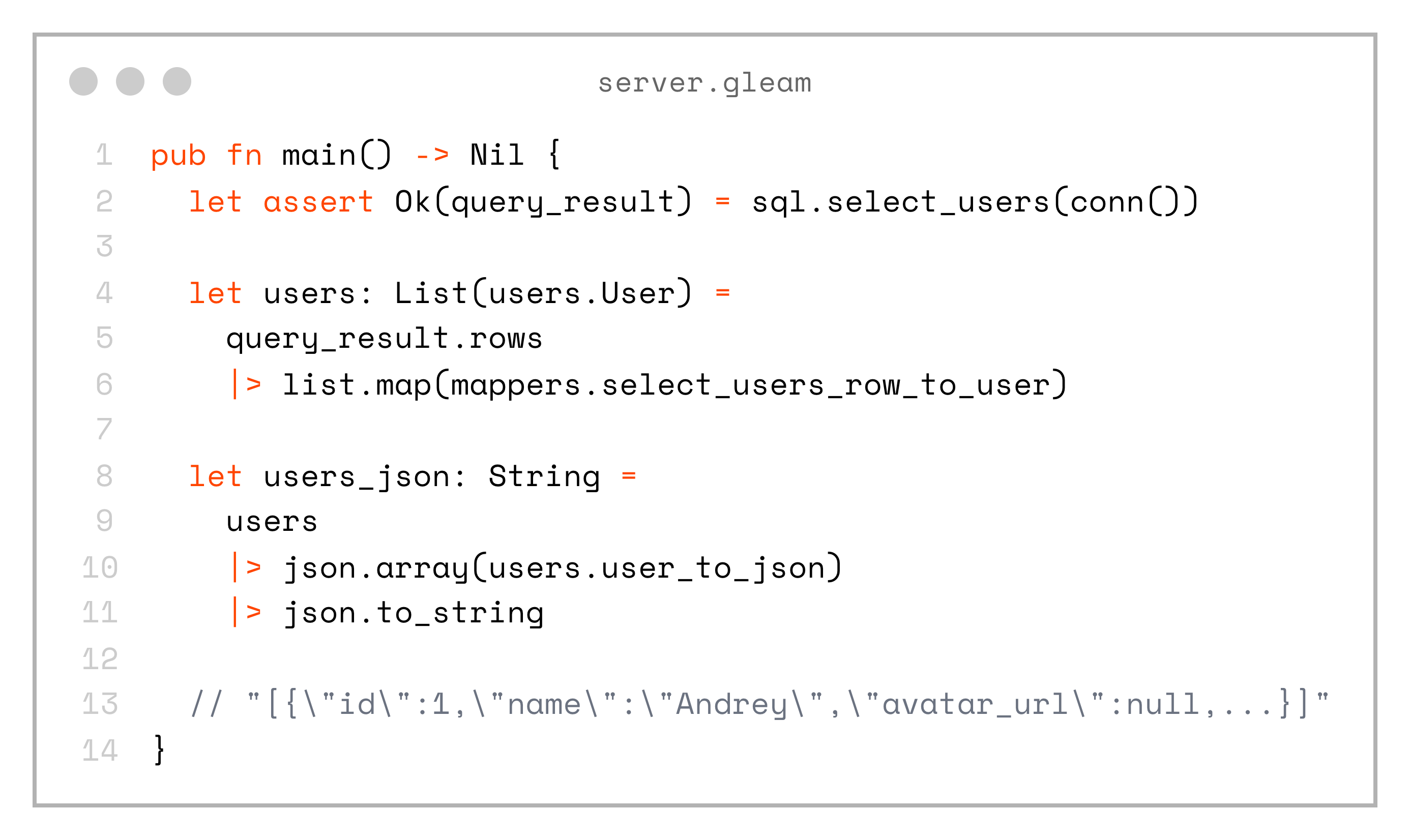 If you want to see a full example, you can check out the project on my GitHub: https://github.com/andfadeev/learn_gleam/tree/master/type_safety