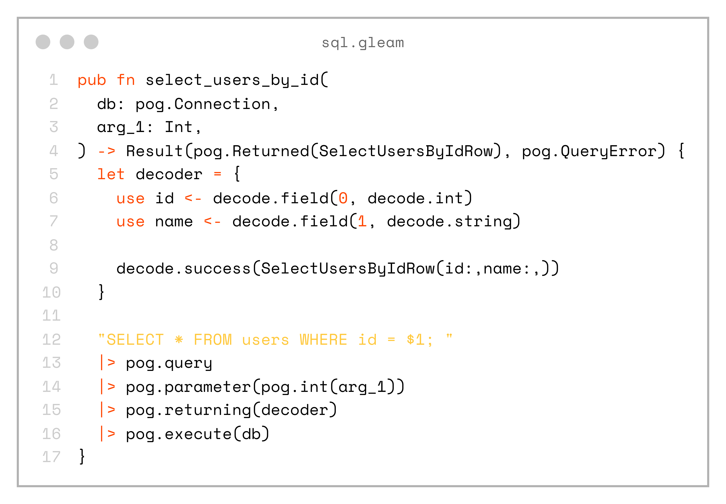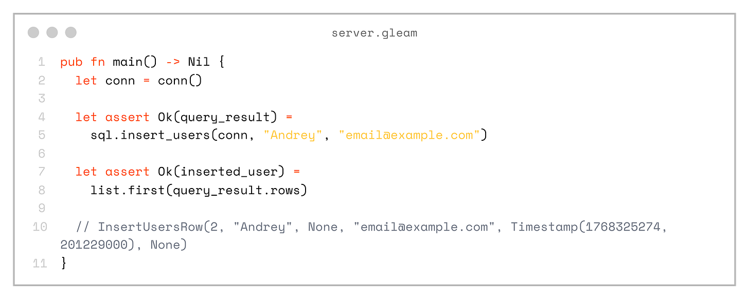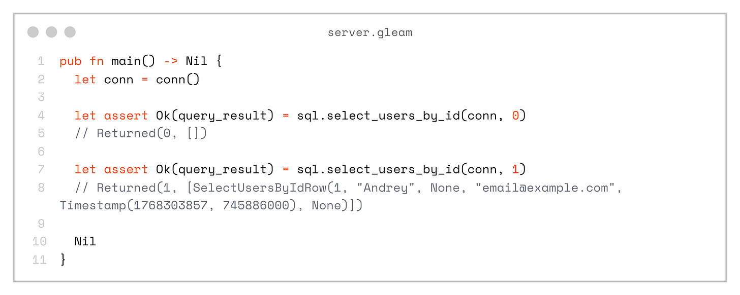 If the database schema changes in an incompatible way and we regenerate sql.gleam, the compiler will immediately show errors in the project that need to be fixed.