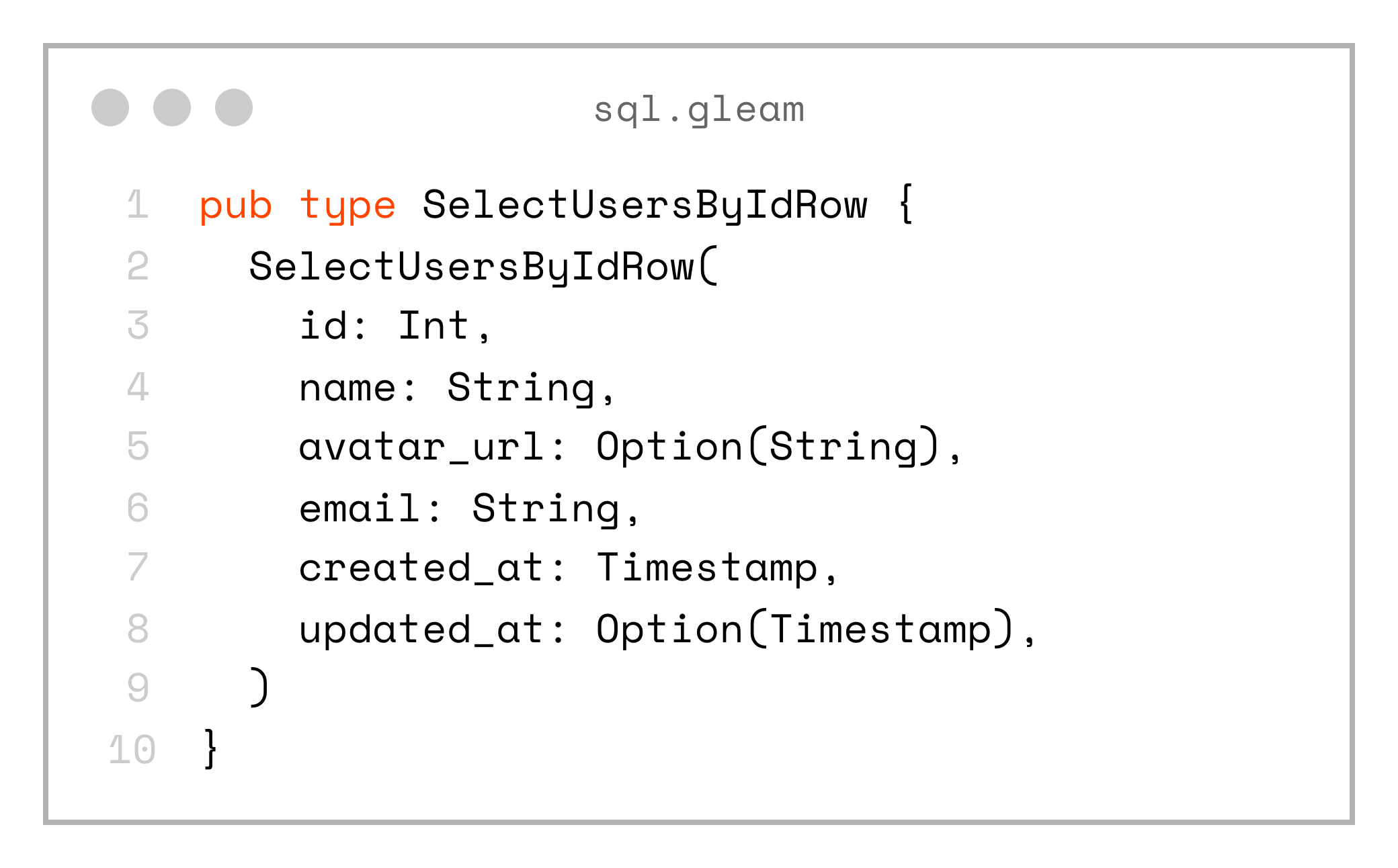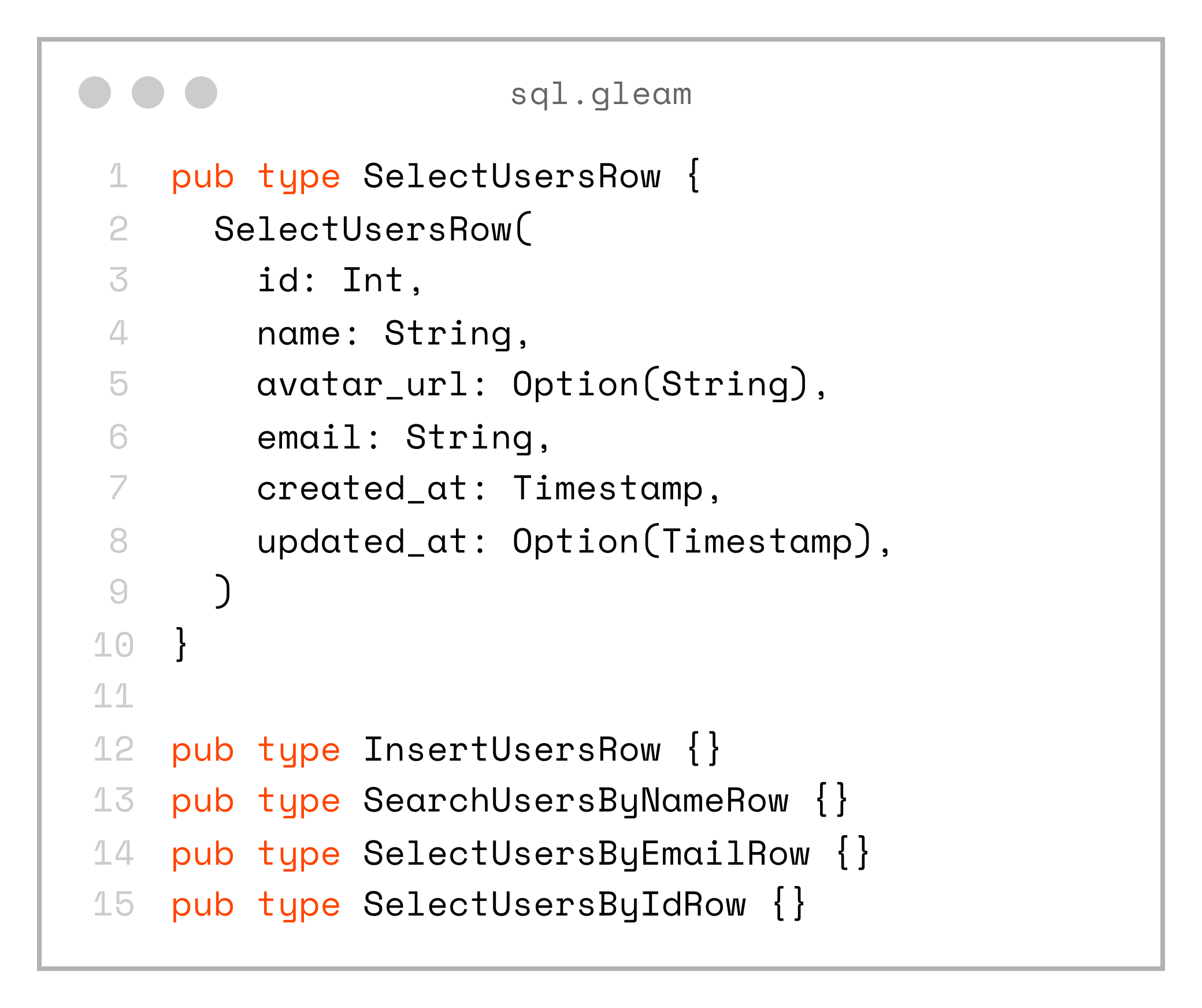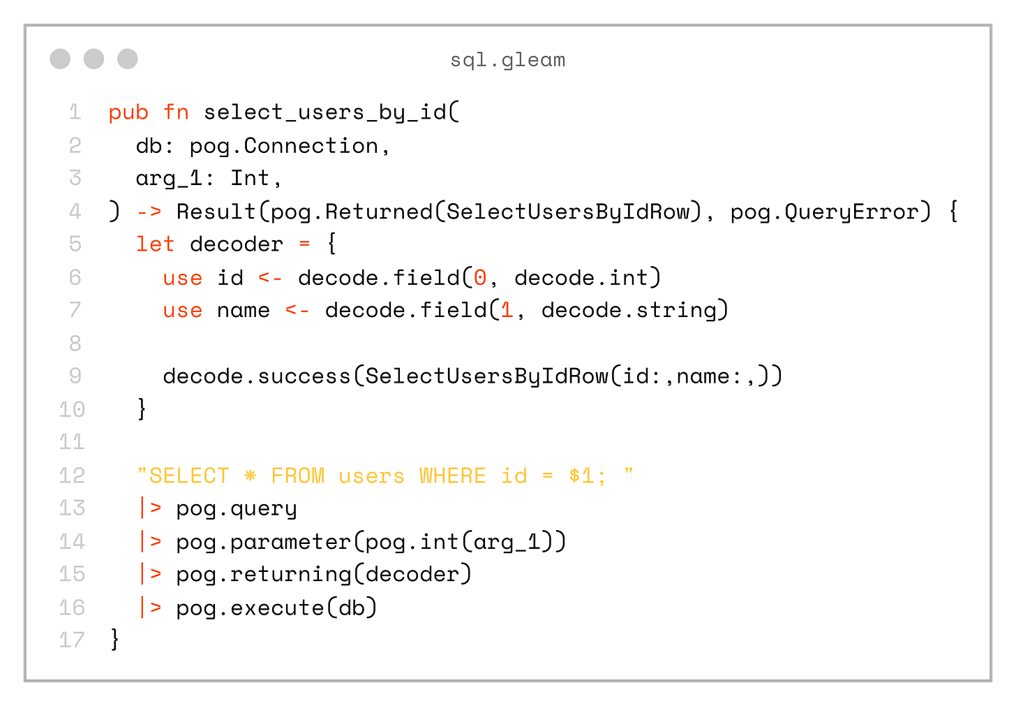 If the database schema changes in an incompatible way and we regenerate sql.gleam, the compiler will immediately show errors in the project that need to be fixed.