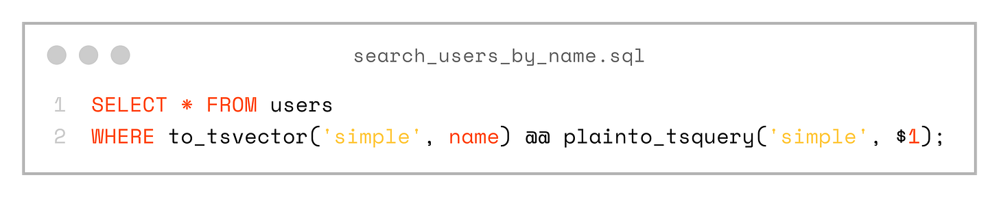 SELECT * FROM users WHERE id = $1;These queries are trivial for now, but we’re not limited in any way — each SQL file can contain any SQL that PostgreSQL understands. For example, we can start using full-text search right away: