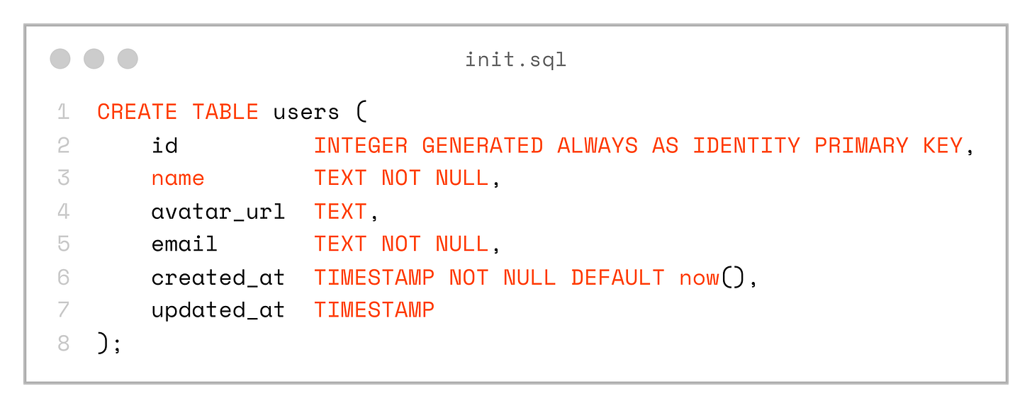Let’s apply a pragmatic Domain-Driven Design (DDD) approach. Suppose we want to store and manage User entities. A sensible first step is to design the database schema, starting with a simple users table that contains a few core fields.