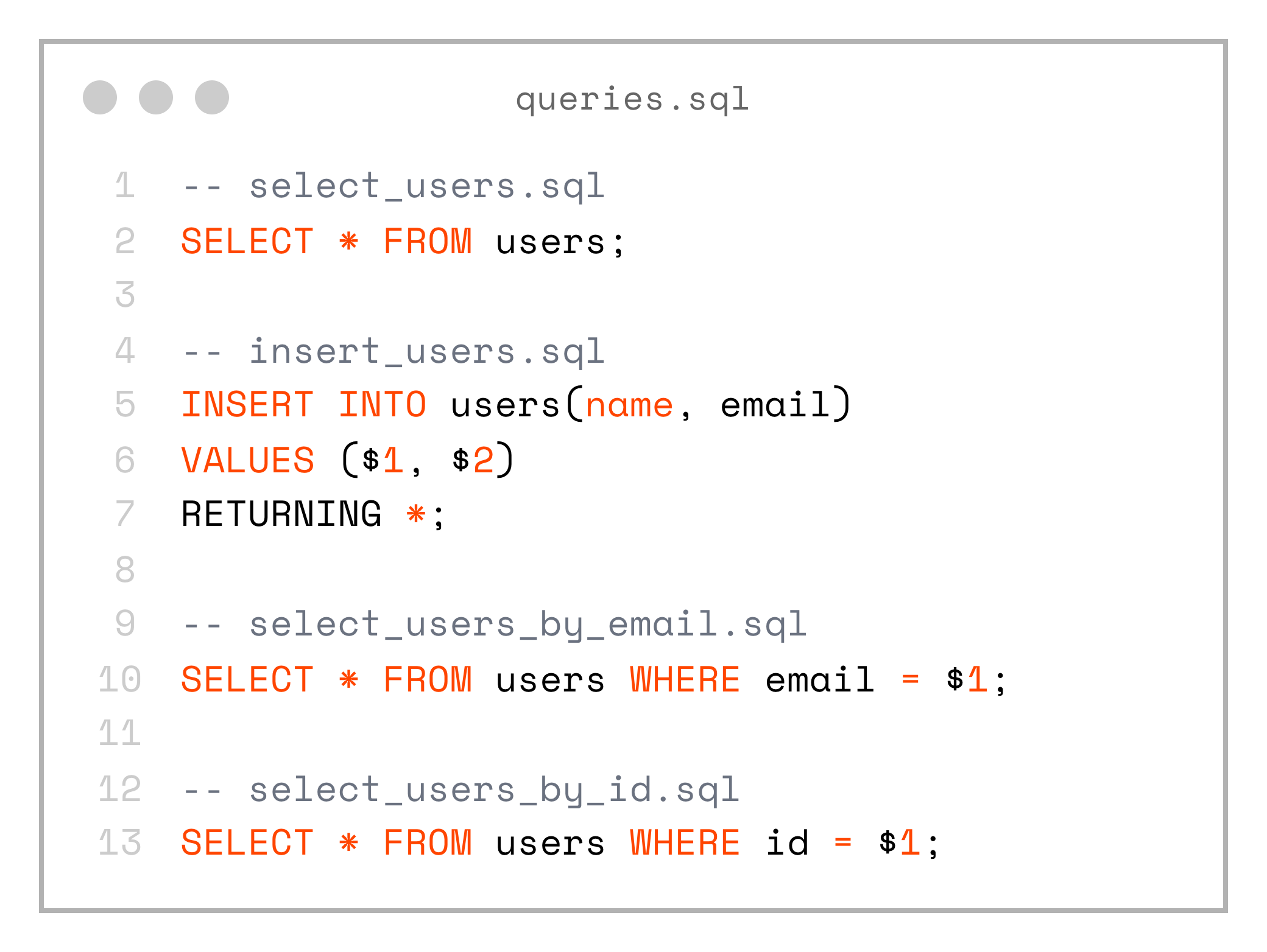 └── select_users.sqlSo we end up with the following SQL files: select_users.sql, select_users_by_id.sql, select_users_by_email.sql, insert_users.sql