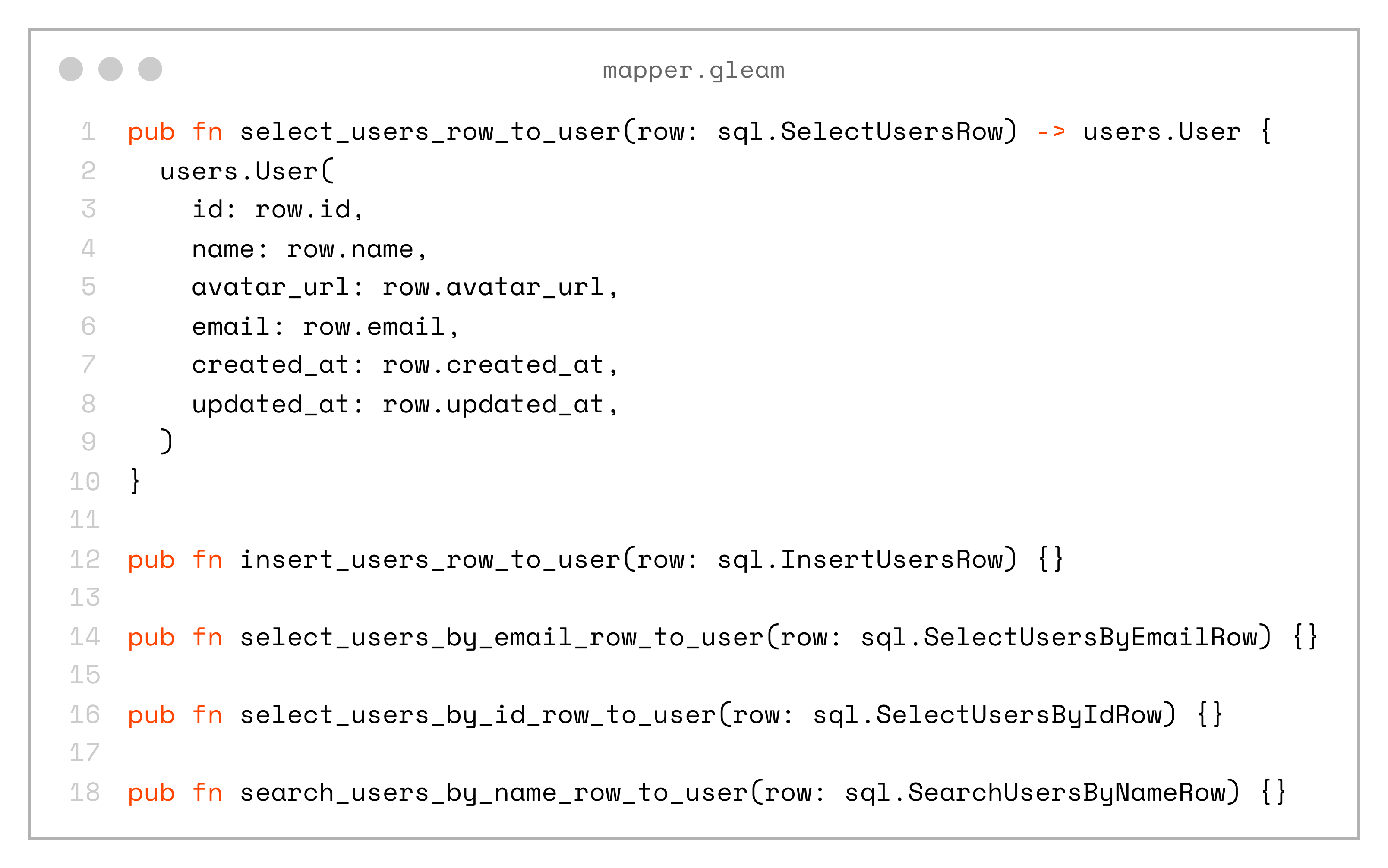 pub fn search_users_by_name_row_to_user(row: sql.SearchUsersByNameRow) {}Yes, this approach introduces some code duplication, and when there’s a one-to-one mapping with the domain model it can feel redundant. But, in real-world applications it’s often much more useful, as it adds a layer of abstraction that can hide the underlying database structure, allow remapping of fields, and more.