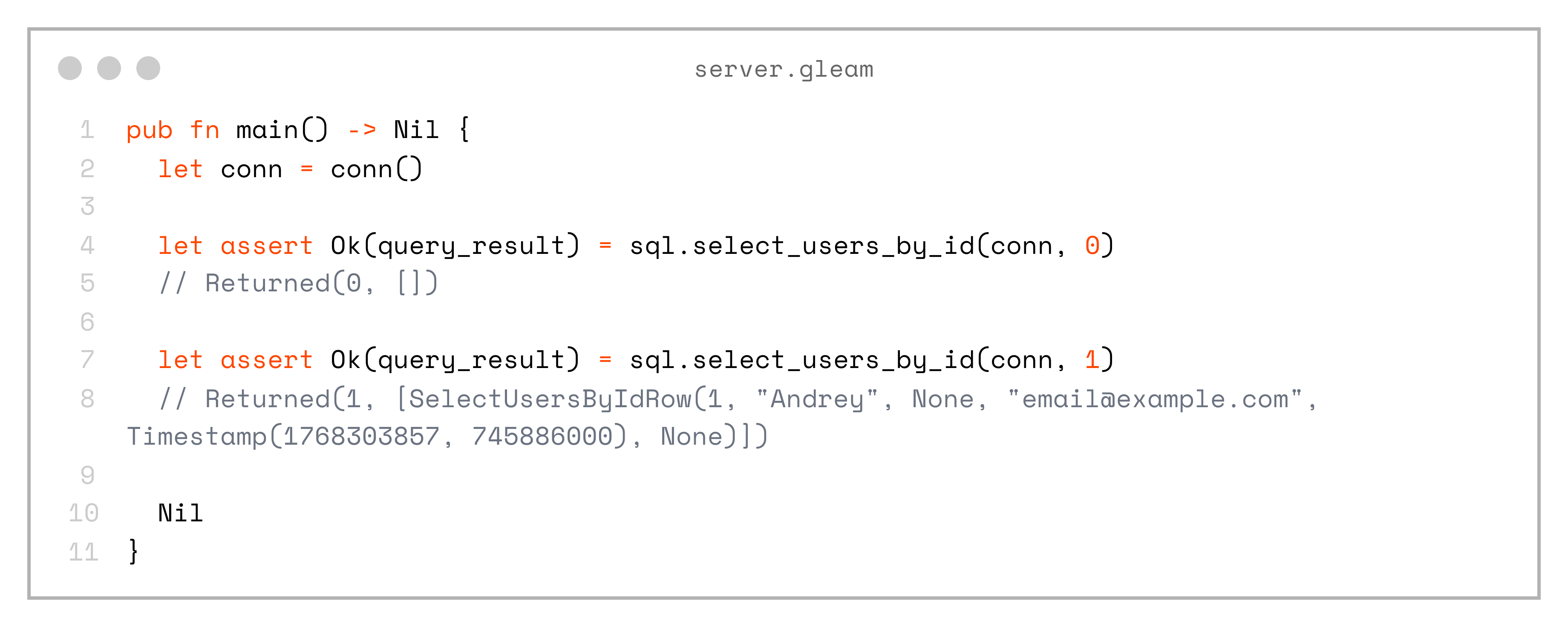 let assert Ok(query_result) = sql.select_users(conn())
